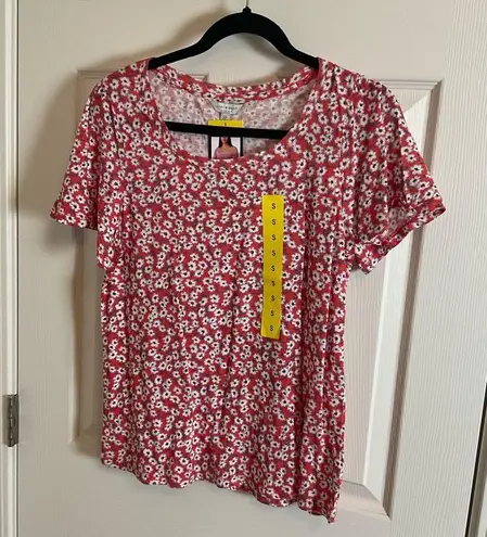 Chic red blouse with white floral pattern. Short sleeves and round neckline. Perfect for casual outi... Show more