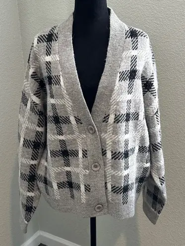 Cozy plaid cardigan with button-up front. Features a stylish black and gray pattern. Oversized Mediu... Show more