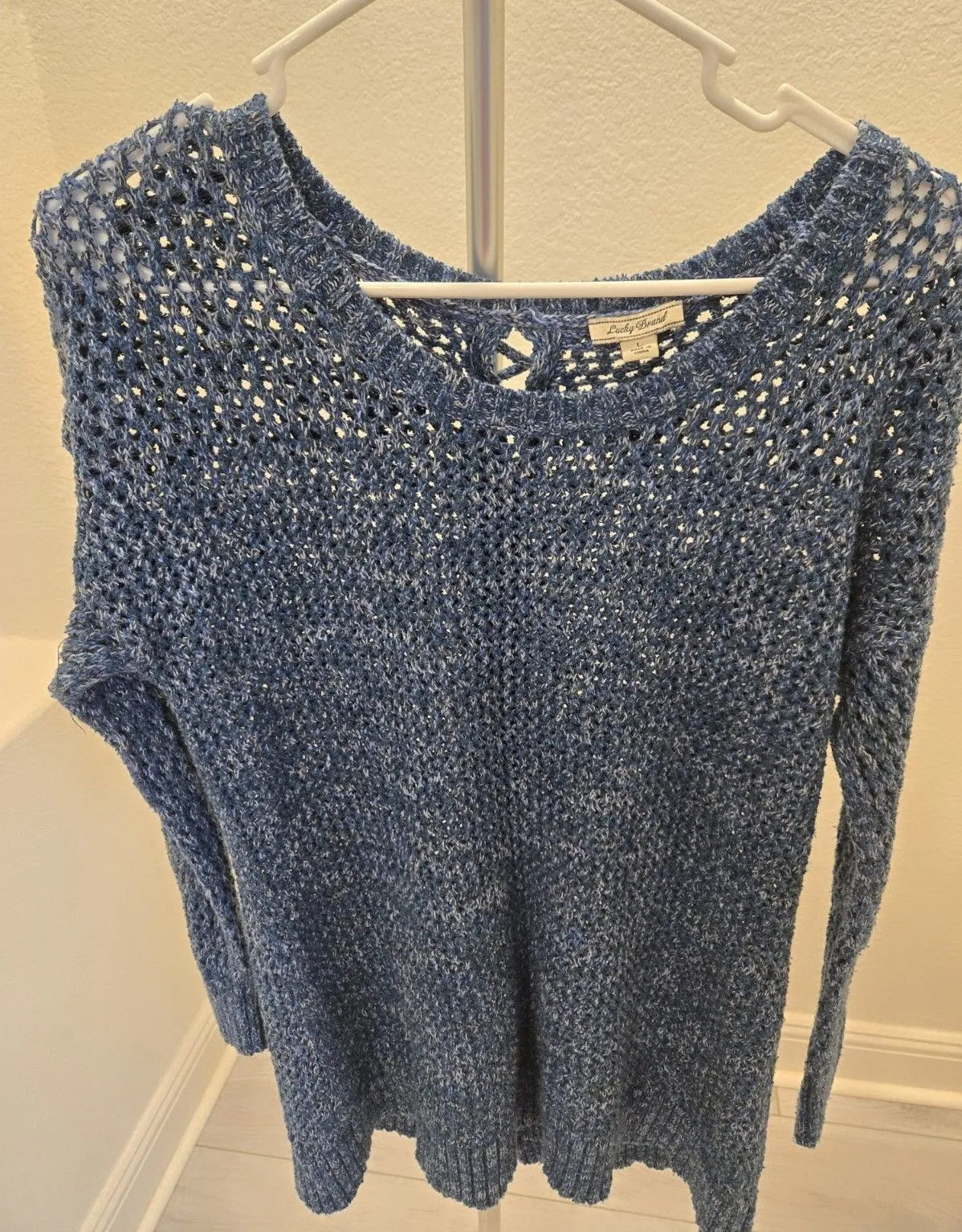 This is a unique Lucky Brand open-knit back design. It's a long-sleeve pullover style with a texture... Show more