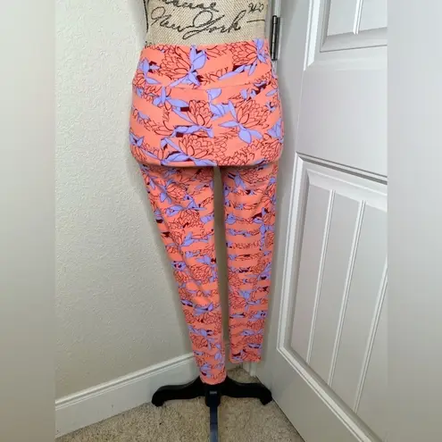 LuLaRoe Print Leggings In excellent condition Peachy Orange in Color with Red & Purple Lotus Plants... Show more