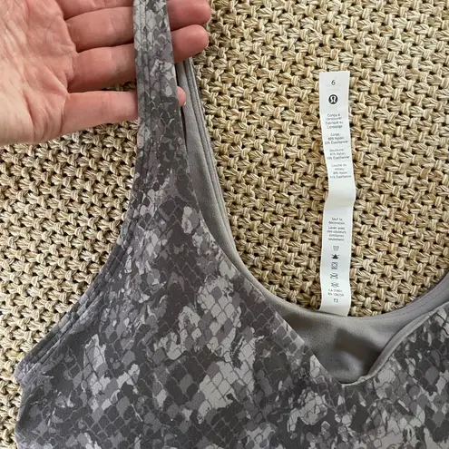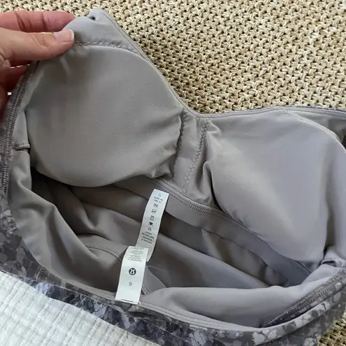 Stylish gray patterned sports bra with a unique design. Perfect for workouts. Preowned in great con... Show more