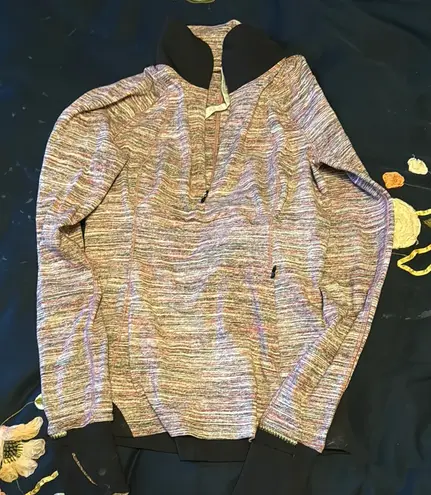 Stylish zip-up sweater with a multicolor pattern. Ideal for casual wear.