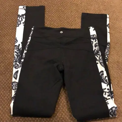 Lululemon leggings. Black pants w 1 3/4” stripe on side in Cream w floral design. Inseam approx 32”.... Show more