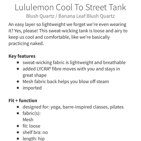 LULULEMON ATHLETICA Blush Quartz/Banana Leaf Cool To Street Tank Top. Rip tag is gone, will best fi... Show more
