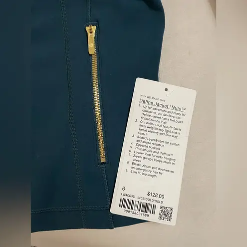 Lululemon NWT Define Jacket Full Zip Nulu Material Indochine Blue Gold Size 6 Blue jacket with gold... Show more