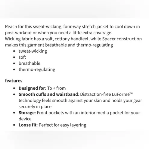 Pre Owned in Excellent Used Condition Stylish black hoodie jacket. Features bold Lululemon brandin... Show more