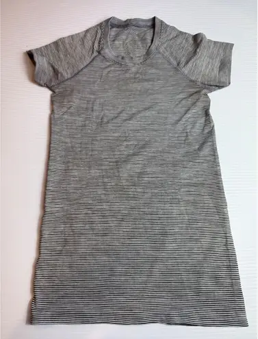 Keywords: Lululemon, Swiftly Tech, Racerback, Short Sleeve Top, Athletic Top, Workout Shirt, Running Top, Yoga Top, Striped Top, Relaxed Fit, Size 4, Gray Black, Activewear, Athleisure Wear
