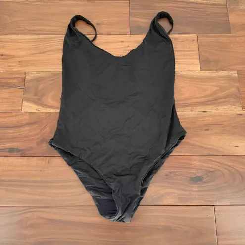 A classic black V-neck one-piece swimsuit. This sleek design features adjustable straps and a low-cu... Show more