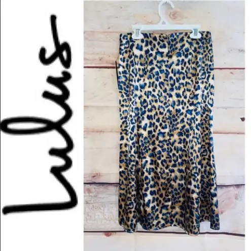Brand new with tags:) Global Icon tan & navy blue leopard print satin skirt by Lulus Midi style Zip... Show more