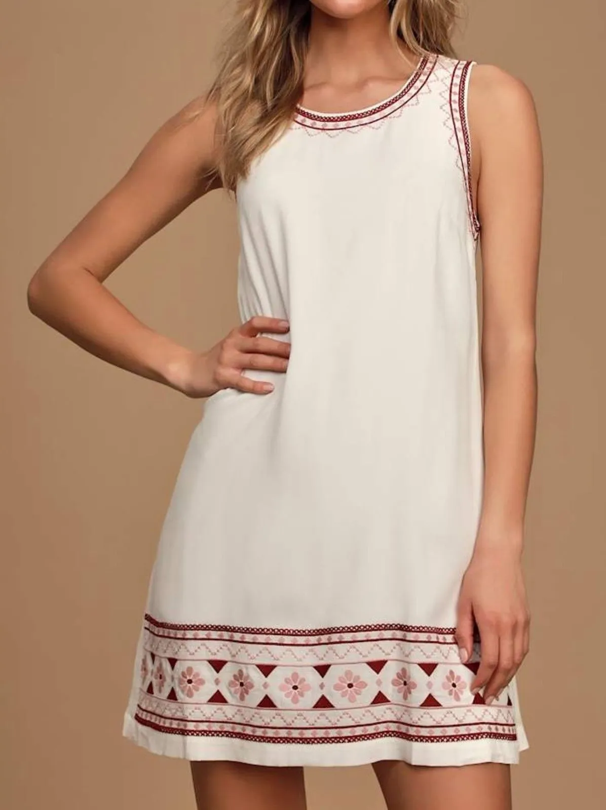 Lightweight, gauzy woven fabric falls from wide tank straps into a rounded neckline and darted bodice. A breezy, shift silhouette ends in a mini hem. Intricate burgundy and pink embroidery creates a flirty pattern as it trims the neckline, bodice, and hem. Back keyhole with top button closure. Excellent preloved conditions
