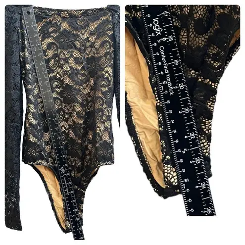 New With Tags Square Neck Black Lace Beige Nude Liner Thong with Hidden Snap Closures Long Sheer Sle... Show more