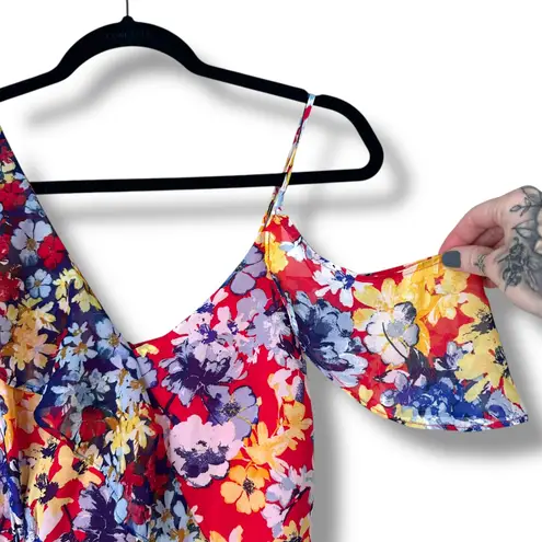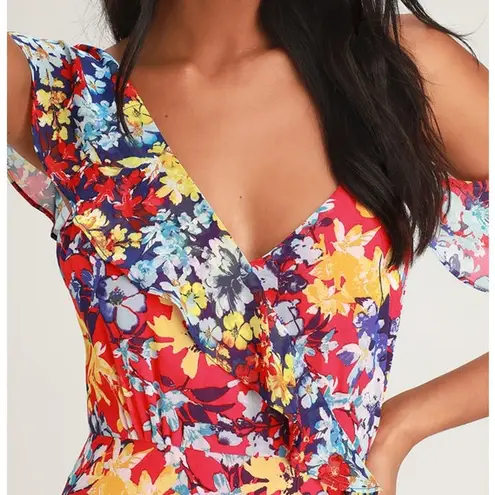 Lulus Radiant Ruby Red Floral Print Chiffon Asymmetrical Maxi Dress. V-neckline, darted bodice, emp... Show more