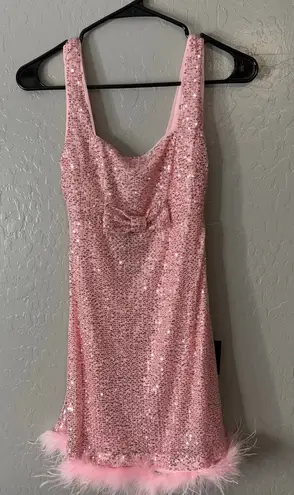 Popular Invite Pink Sequin Mesh Feather Mini Dress Style 2209336 retail $68 measurements laying flat... Show more