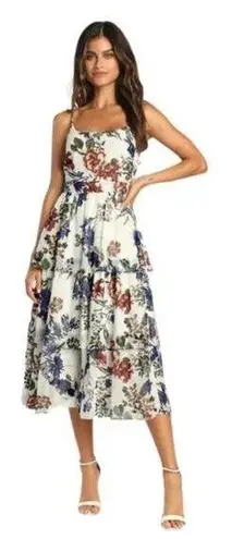 "The Lulus Romantic Visionary White Floral Sleeveless Tiered Midi Dress will have everyone in admira... Show more