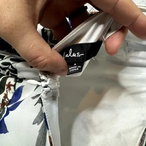 "The Lulus Romantic Visionary White Floral Sleeveless Tiered Midi Dress will have everyone in admiration of your sense of style! Lightweight woven chiffon, decorated with a sophisticated floral print throughout, shapes a darted bodice, a scoop neckline, cottagecore, and adjustable spaghetti straps. A high, set-in waist tops a tiered ruffle skirt that ends at a midi hem. Hidden back zipper/clasp." Fully lined. Shell: 100% Polyester. Lining: 96% Polyester, 4% Spandex.