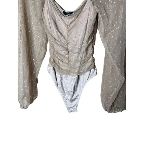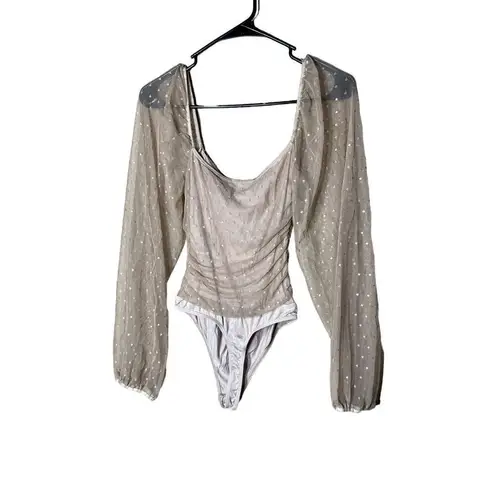 Lulus Ruching Around Town Beige Swiss Dot Long Sleeve Bodysuit Size XS. Sheer sleeves. Snaps at bott... Show more