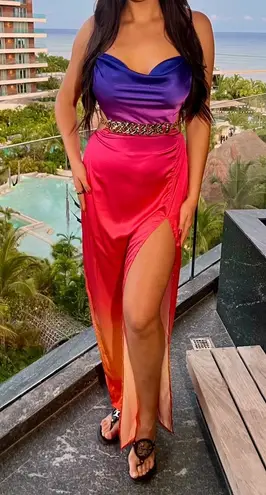 Stunning open back cowl neck maxi dress with a vibrant purple and pink ombré. Belt not included - m... Show more