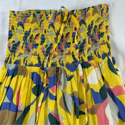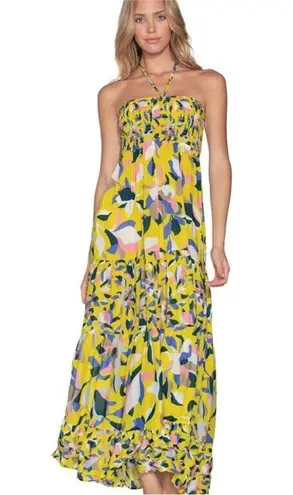 Tropical maxi dress in a vibrant yellow with colorful floral print, convertible to strapless, halter... Show more