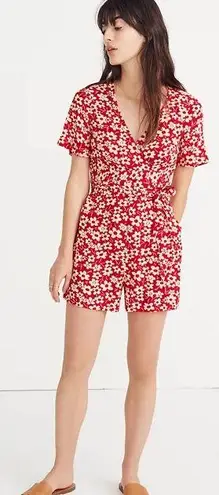 Size 00 -Red/crème floral wrap front romper, back zip closure, hidden front pockets, relaxed non str... Show more