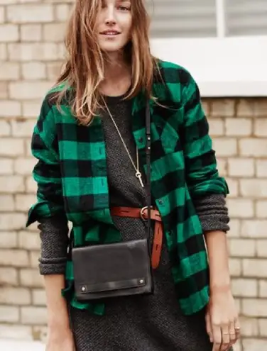Stylish green and black plaid button-up shirt. Features a classic collar and chest pocket Style: Lo... Show more