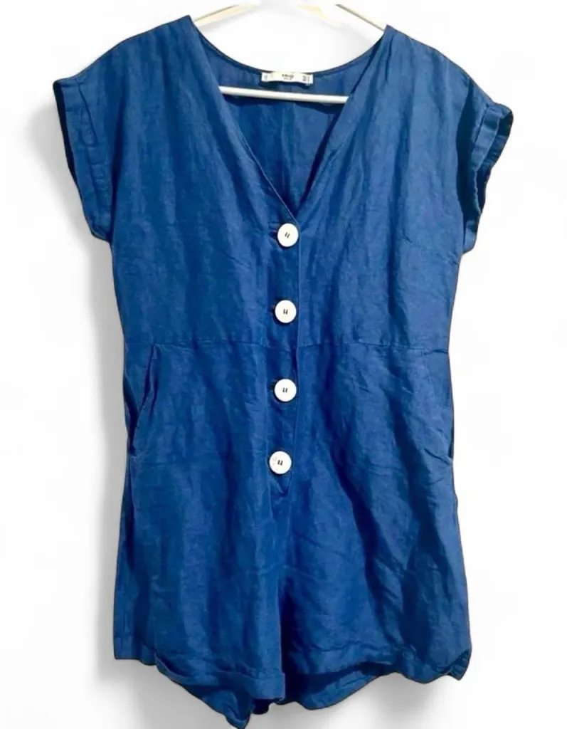 Mango Blue Playsuit Romper Size Size 6 / Medium Has a v-neck, short sleeves, cuffed shorts, and c... Show more
