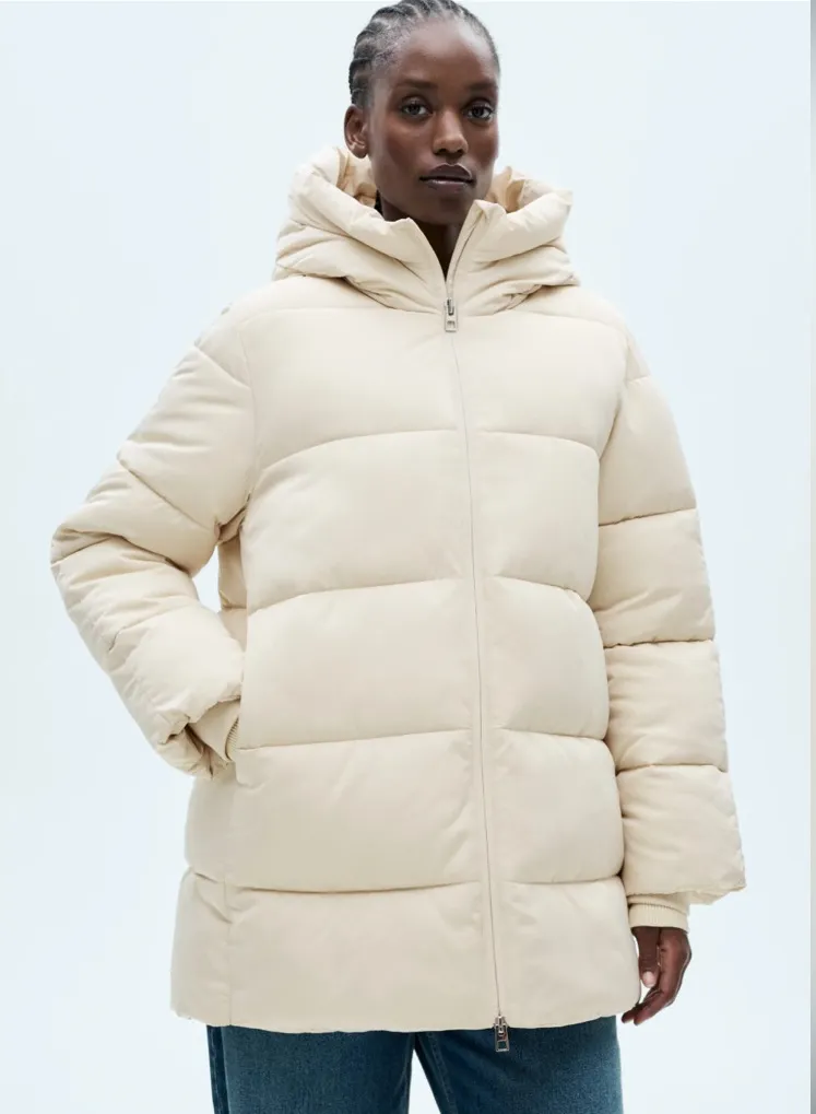 Stay warm and stylish with this cream puffer jacket. Water-repellent: The durable finish of this garment protects against light rain, repelling contact with water and raindrops.