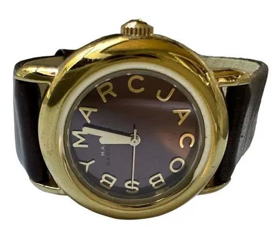 MARC BY MARC JACOBS MBM1185 Analog Brown Leather and Dial Gold Tone Round Watch Very good to excellent condition with minimal signs of wear and nothing that stands out. A new battery has been installed for sale.
