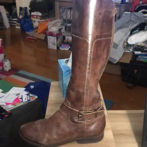 Size 8.5 riding boots Brown, extended calf Wear on the bottom of shoes (see pics)