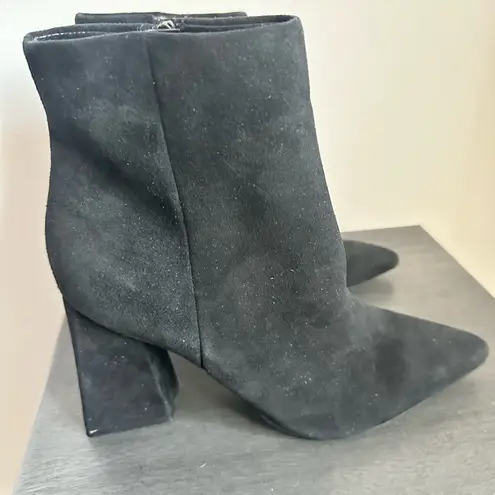 These booties feature a pointed toe, a block heel, and a side zipper closure. They are considered a... Show more