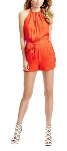 Vibrant orange Marciano halter romper with a sleek, minimalist silhouette. Features a rounded neckli... Show more