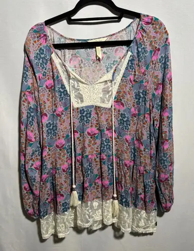 Matilda Jane Floral Peasant Top Tiered Lace Prairie Boho Cottage Long Sleeve M womens medium cuff sleeves tunic lacey girly coquette flowy bohemian all over print flowers ditsy floral aop purple blue cream tassels tie neck oversized lightweight breathable hippie modest whimsical fairy casual rayon This is a preowned item and may have some wear. Please see photos for details. Wear to tassels.