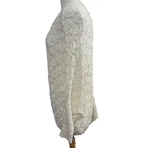 This is a pre-owned Maurices off-white crochet cardigan. It is a size small and features a v-neck, l... Show more