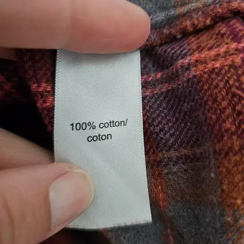 heavier flannel fabric plaid print long easy to roll sleeves button down front functional front pock... Show more