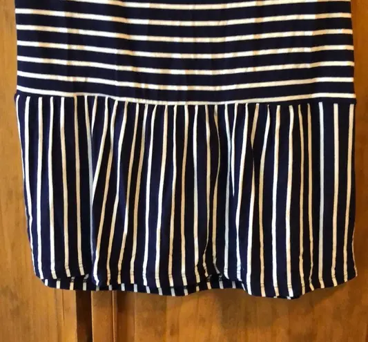 Maurice’s navy and white stripe peplum tunic shirt with open back. Size medium. 95% rayon 5% spand... Show more
