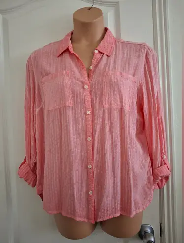 Chic coral button-down shirt by Maurices. Features a classic collar and front pockets. Ideal for cas... Show more