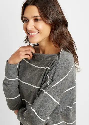 Stylish gray sweater with white stripes. Features a boat neck design and long sleeves.