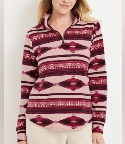 Size large Red, burgundy and pale pink color Geo print pattern Quarter zip Long sleeve Soft fleece m... Show more