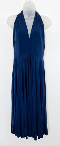 Max and Cleo navy halter midi dress in size Large. Features a deep V neckline, open back with tie closure, and pleated skirt. Fabric is 96% polyester and 4% spandex. Excellent condition. No visible flaws. See all photos for details. Style: retro glam, minimalist, timeless elegance, resort eveningwear, cocktail party, wedding guest, vintage-inspired, formal, 2000s fashion, night out, statement silhouette, elegant core, draped fit Approximate Measurements (taken flat lay): Length: 49" Pit to Pit: 18.5" (stretches to 22") Waist: 17" (stretches to 20")