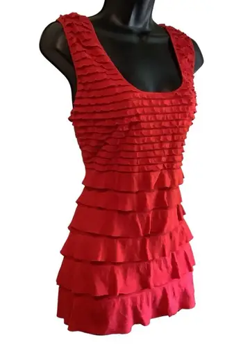 MaxEdition Flattering mini dress/long blouse or swimsuit cover up, with layered ruffles. Bold red hue. Bold and sassy. Total length from shoulder to hem @ 27” Pit to pit @ 18”