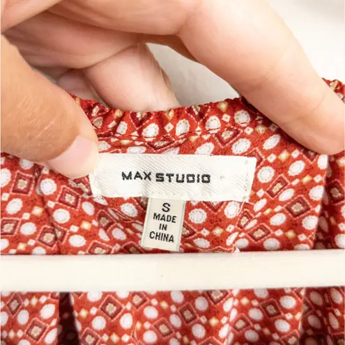 Rust red printed crepe long sleeve peasant blouse with ruffled sleeves and smocked elastic cuffs by... Show more