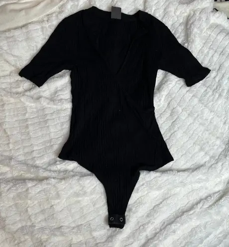 MAY PINK Black‎ Ribbed 1/2 Sleeve Bodysuit V Neck Snap Closure Neutral Black - $5 - From thisol