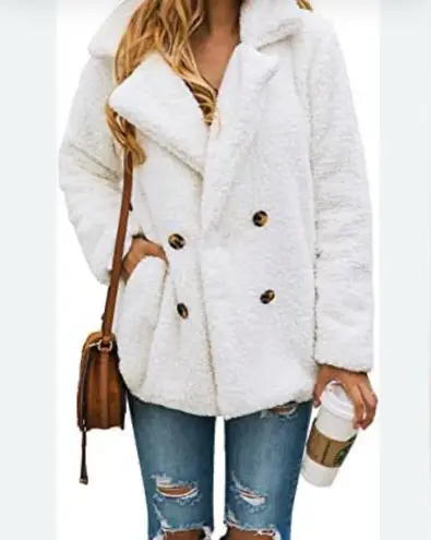 Embrace warmth and comfort with this Me Jane Teddy Jacket in a soft white hue. Its plush, fuzzy texture and relaxed fit make it an ideal choice for chilly days. The wide lapel collar adds a touch of elegance to this cozy essential. "New without tags"