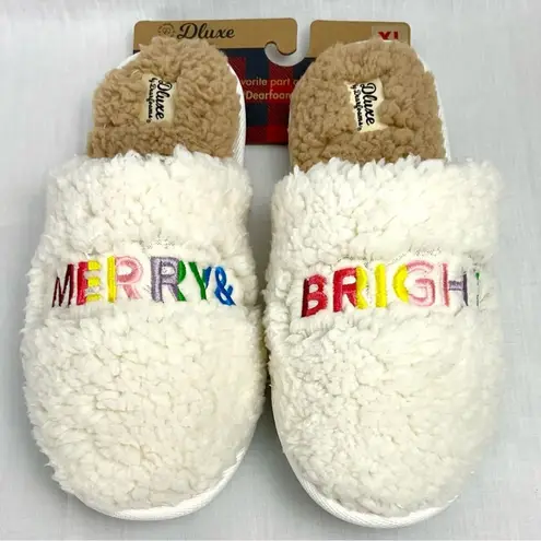 Merry & Bright Slippers Teddy Slide Dearfoams Rainbow Stitching Fit & style: Teddy upper with rainbow embroidery stitching Flannel lining and teddy sock Machine washable for long lasting freshness Cushioned insole with memory foam comfort Easy on/off silhouette with non skid TPR outsole Women's Sz XL 11/12 New on original retail packaging Holiday Christmas Rainbow Inclusive giftable gift giving gift exchange Warm Cozy comfy soft plush washable Teddy Slippers Slides Winter cold weather festive