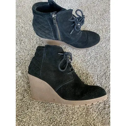 These stylish MIA wedge ankle boots feature a soft black faux-suede upper, quilted heel detail, lace... Show more
