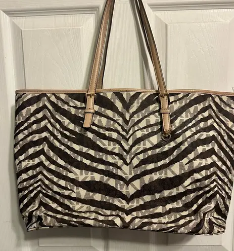 This Michael Kors tote features a striking zebra print in black and cream, offering a bold and styli... Show more