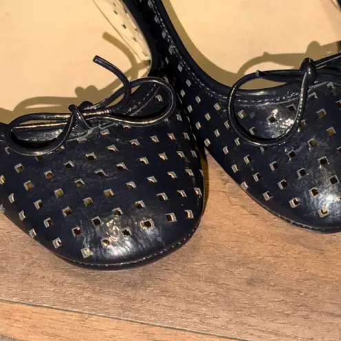 Chic black flats with perforated design. Features a stylish bow accent. Ideal for versatile wear. Th... Show more