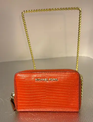 This Michael Kors wallet showcases a vibrant orange color with a luxurious gold-toned logo on the fr... Show more
