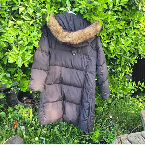 • Down filled mid length jacket in black with natural taupe / tan / brown faux fur hood • Excellent... Show more