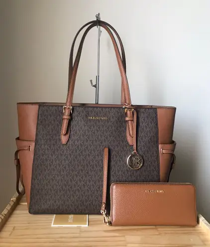100% Authentic MK Gilly large drawstring travel tote Comes with a matching wallet Brown and gold ha... Show more