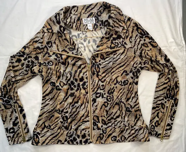 Fabulous Jacket with Great zipper as well as Zippers on the sleeves Gold tone metal Hidden pockets in front as well as well as wider band at base of jacket Animal print is having a popular moment! This can be worn alone or with a tank underneath 95% polyester 5% spandex Resting Measurements Pit to pit. 19.5” Neck to hem: 23”